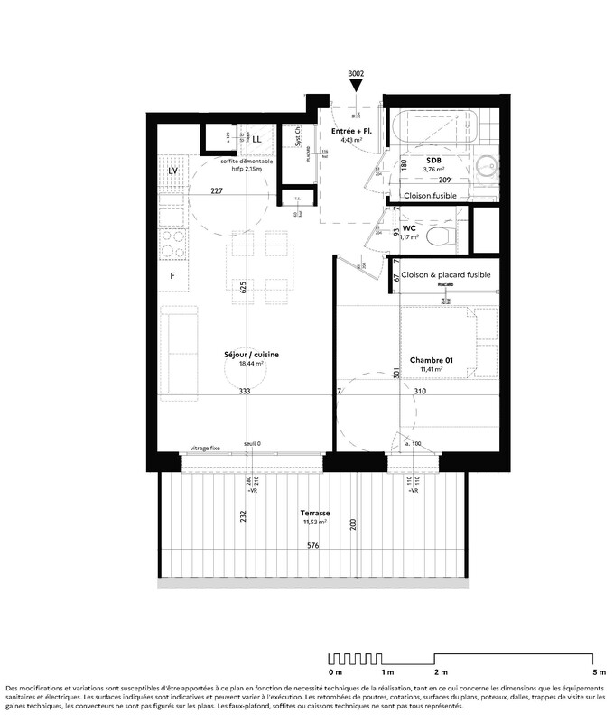 B002 is a 1-bedroom appartment, with a south facing terrasse. Other apartments in this development are available. Please contact us for the full schedule and further information.