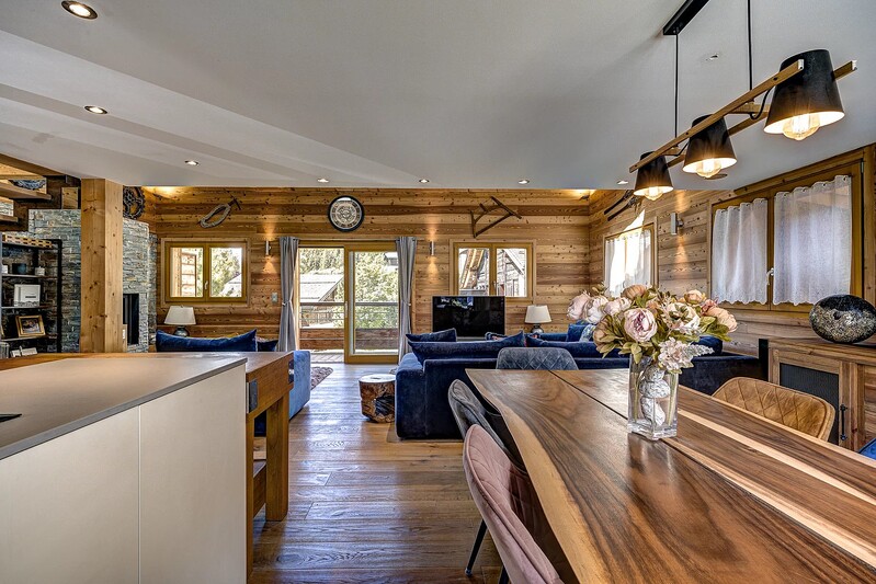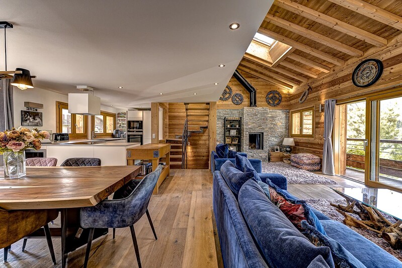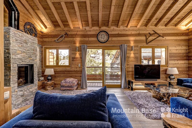 The living area has impressive double height and opens onto the south-facing balcony with wonderful views of the peaks including Mont Blanc. The chalet has excellent energy efficiency (A-rated) and comes with a double garage, hot tub and barrel sauna.