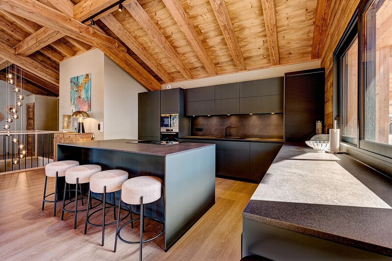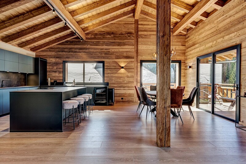 Chalet Athena is a beautiful new-build chalet of 345 m² over three levels, designed to combine space, light, and contemporary alpine style. The property offers six en-suite bedrooms, a striking double-height living room with a modern fireplace and bespoke exposed larch timber frame, a fully equipped high-spec kitchen with island, a ski and bike room, and a double garage, all served by an elevator.