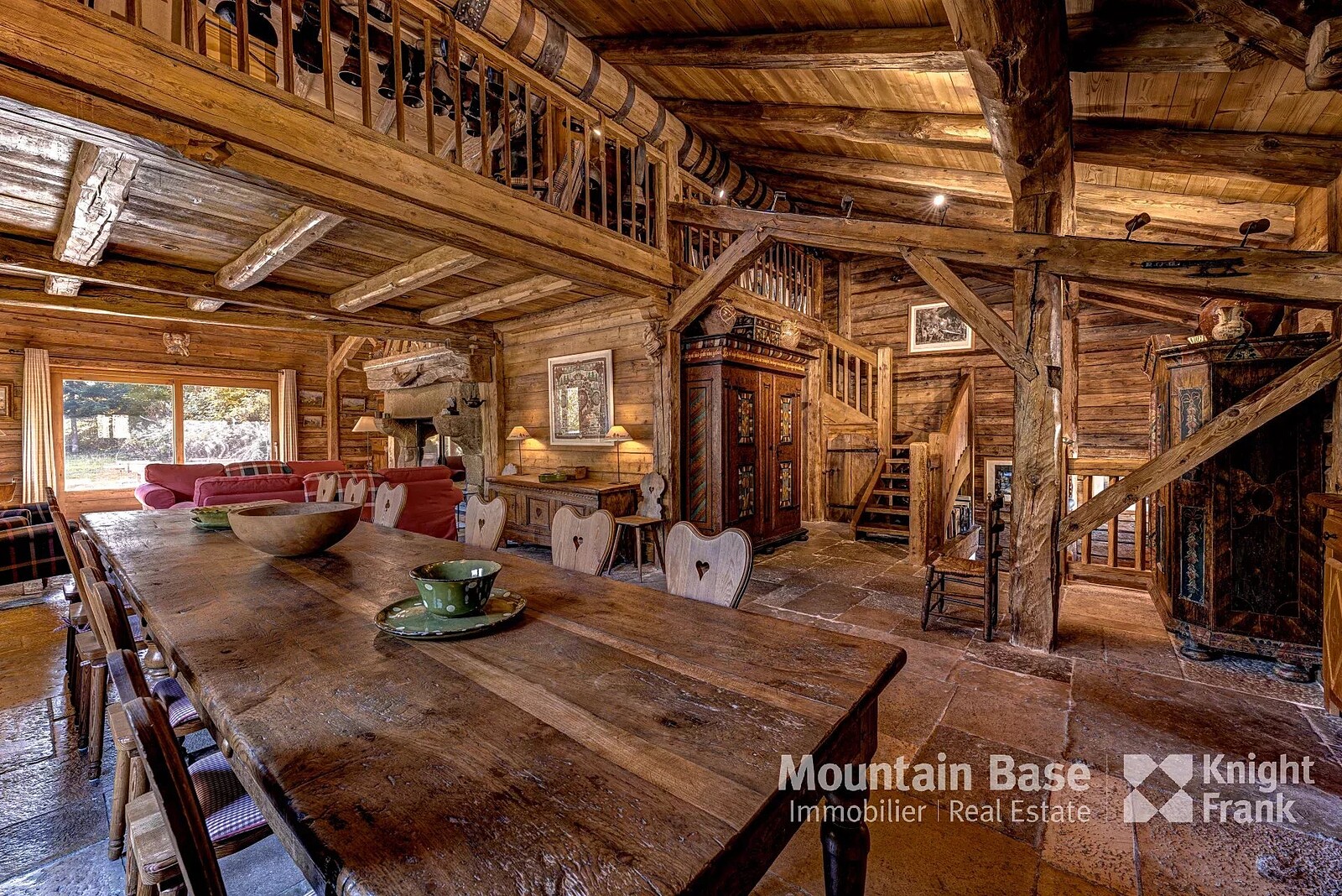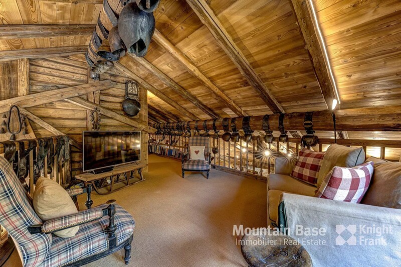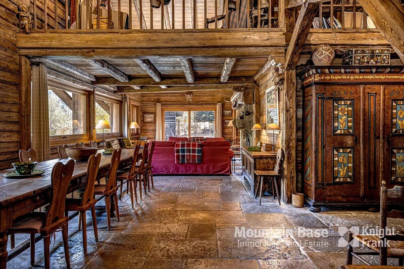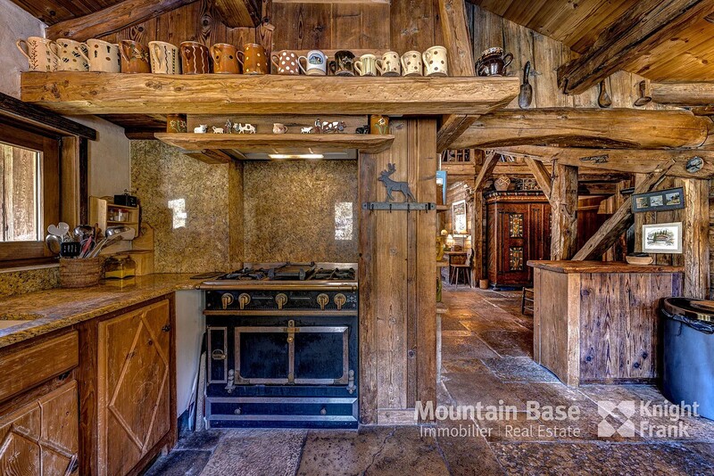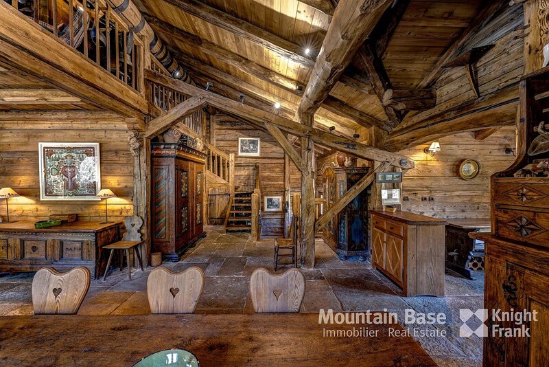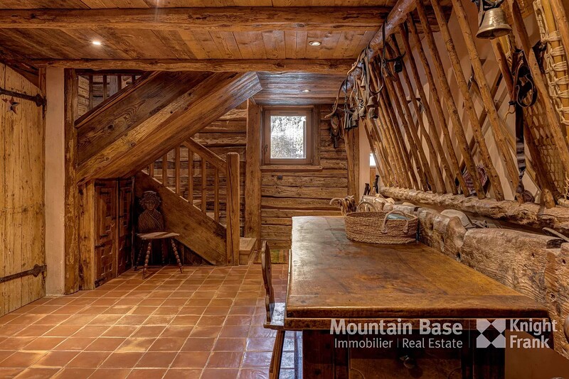 The main living space features a 75 m² open space with high ceilings, a monumental granite fireplace spanning two metres, and a kitchen equipped with a La Cornue range. It opens onto a south-facing terrace and garden offering privacy and serenity, as does the master suite adjacent. On the first floor you'll find an ensuite bedroom hidden behind an 18th century Swiss mazot door as well as a mezzanine serving as a reading area/television room.