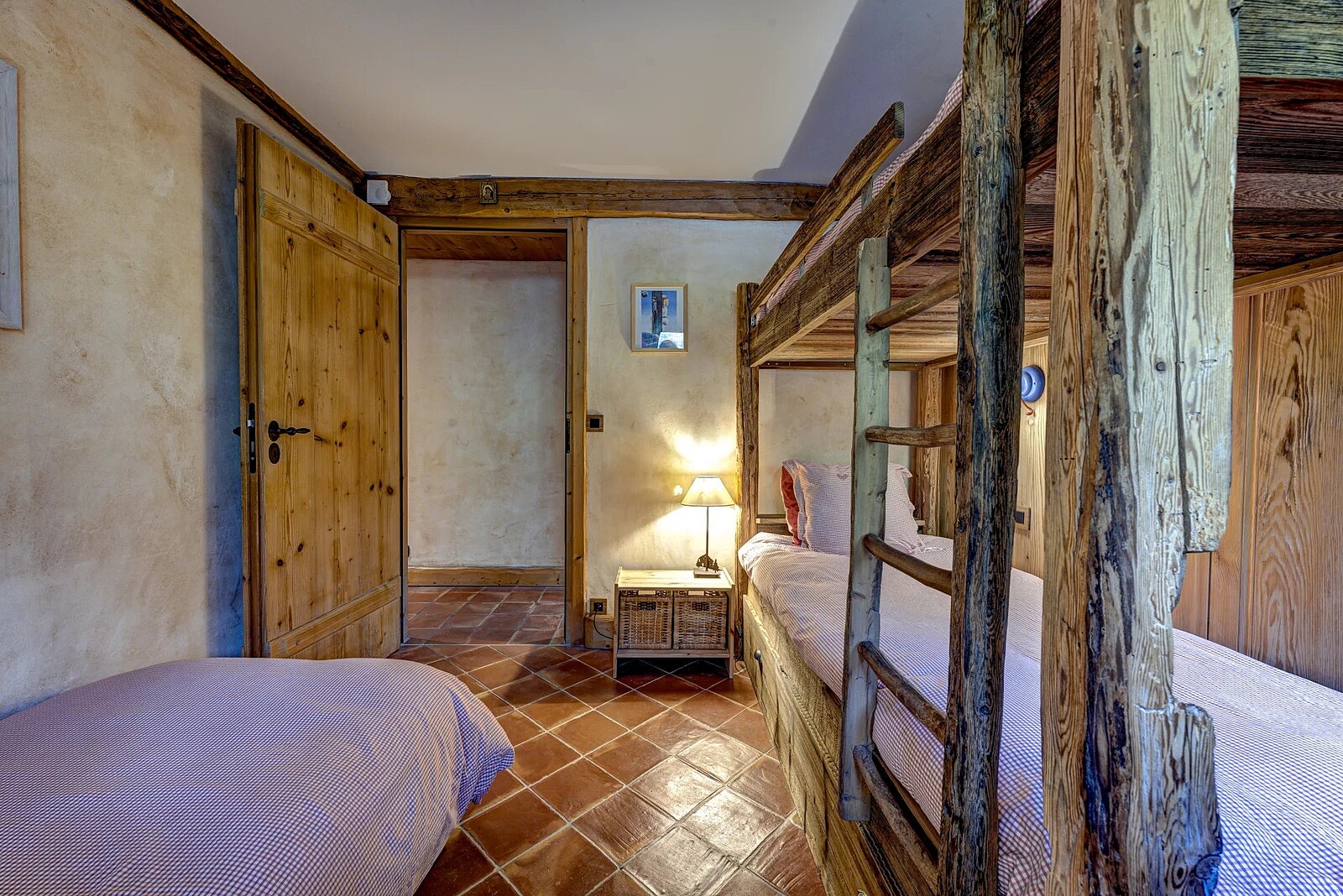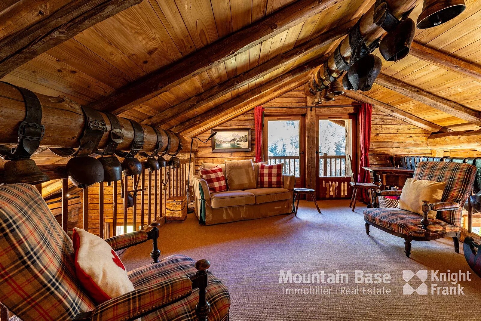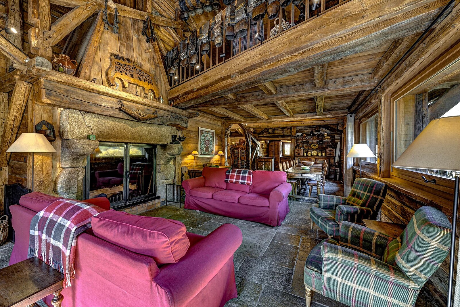 The main living space features a 75 m² open space with high ceilings, a monumental granite fireplace spanning two metres, and a kitchen equipped with a La Cornue range. It opens onto a south-facing terrace and garden offering privacy and serenity, as does the master suite adjacent. On the first floor you'll find an ensuite bedroom hidden behind an 18th century Swiss mazot door as well as a mezzanine serving as a reading area/television room.