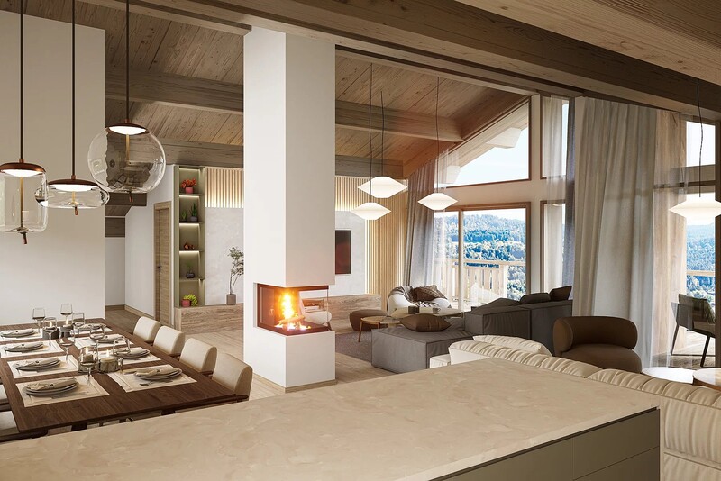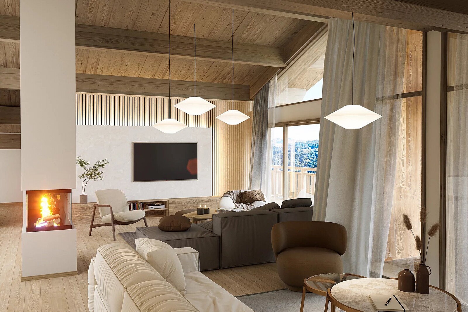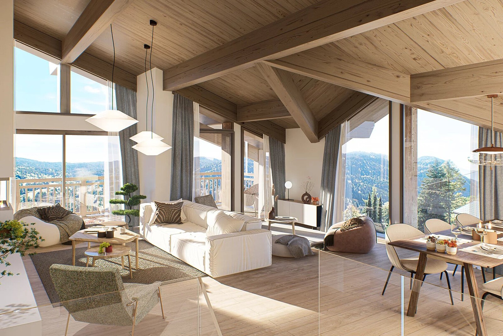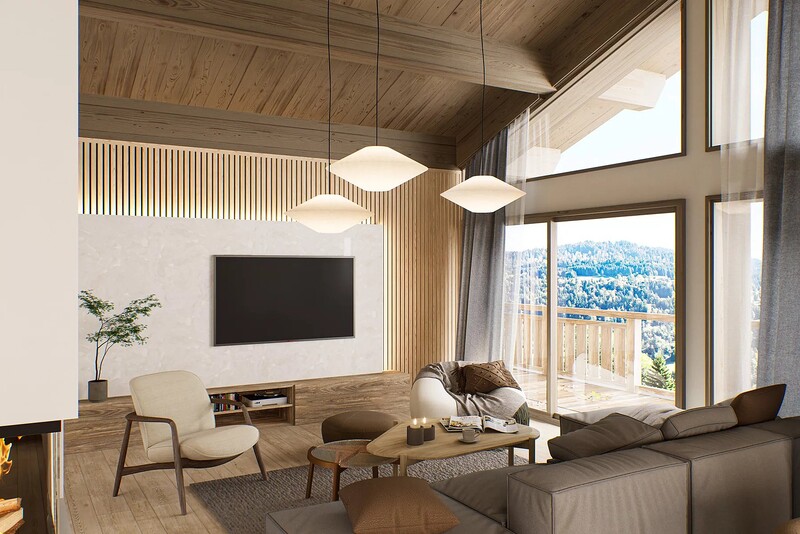 Kandahar is a beautiful off plan detached luxury chalet offering 225m² of living space across 3 floors. Set in a quiet location above Les Gets offering great views of the mountains and village, only 5 minutes drive from the ski lifts. With 5 ensuite bedrooms, and a large living space of 70m² with fireplace and balconies, this is the perfect family chalet.
