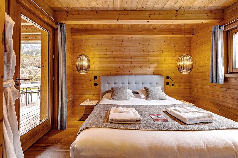 The chalet spans four levels, with the main living area featuring a double-height ceiling and triple-aspect windows for maximum natural light. The ground floor includes a full spa area, complemented by a covered outdoor jacuzzi. All bedrooms in the main house are en-suite with generous balconies, while a fourth-floor dormitory provides flexible overflow accommodation. A large terrace connects the principal chalet to a secondary living/bar area, which sits above a fully independent 1-bedroom apartment.