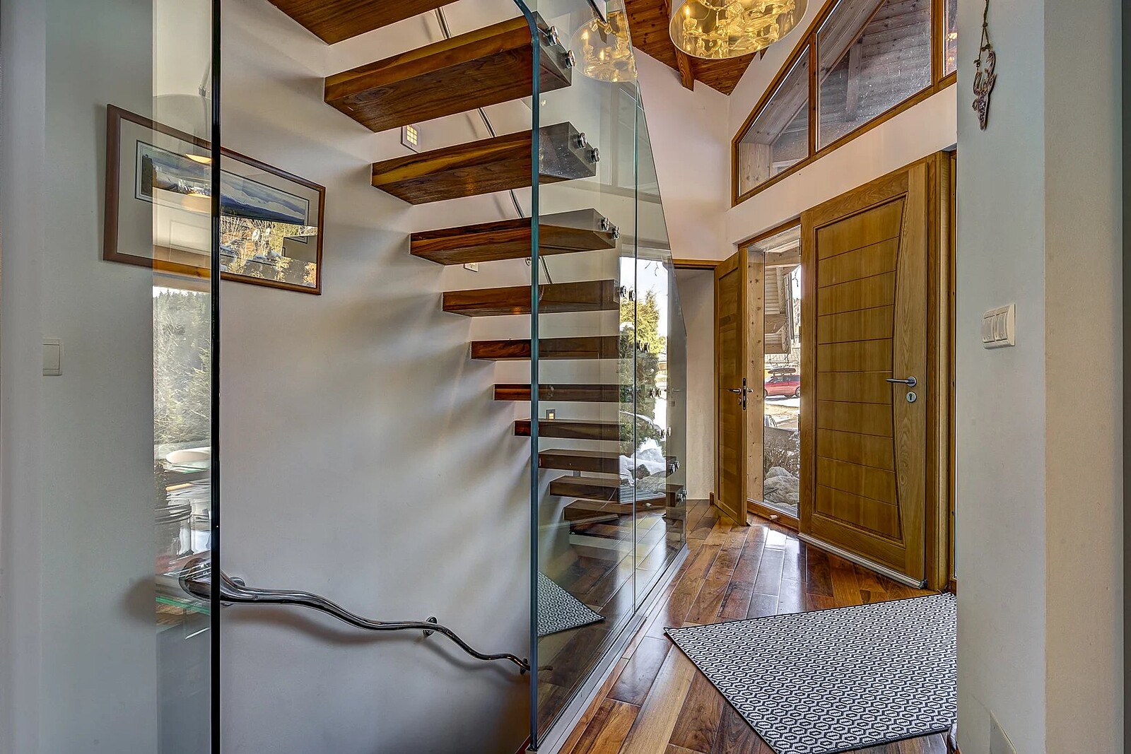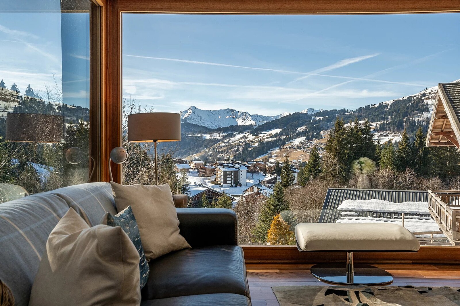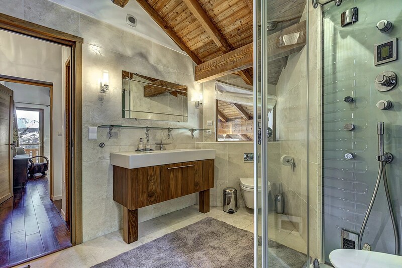 With a modern interior style and exotic wood floors, the centrepiece of the chalet is the living space on the middle floor with picture windows framing the wonderful, west-facing view of the mountains which can also be enjoyed from either of the terraces. There are 3 bedrooms on the top floor, including the master ensuite, plus 2 further bedrooms at garden level sharing 2 bathrooms.