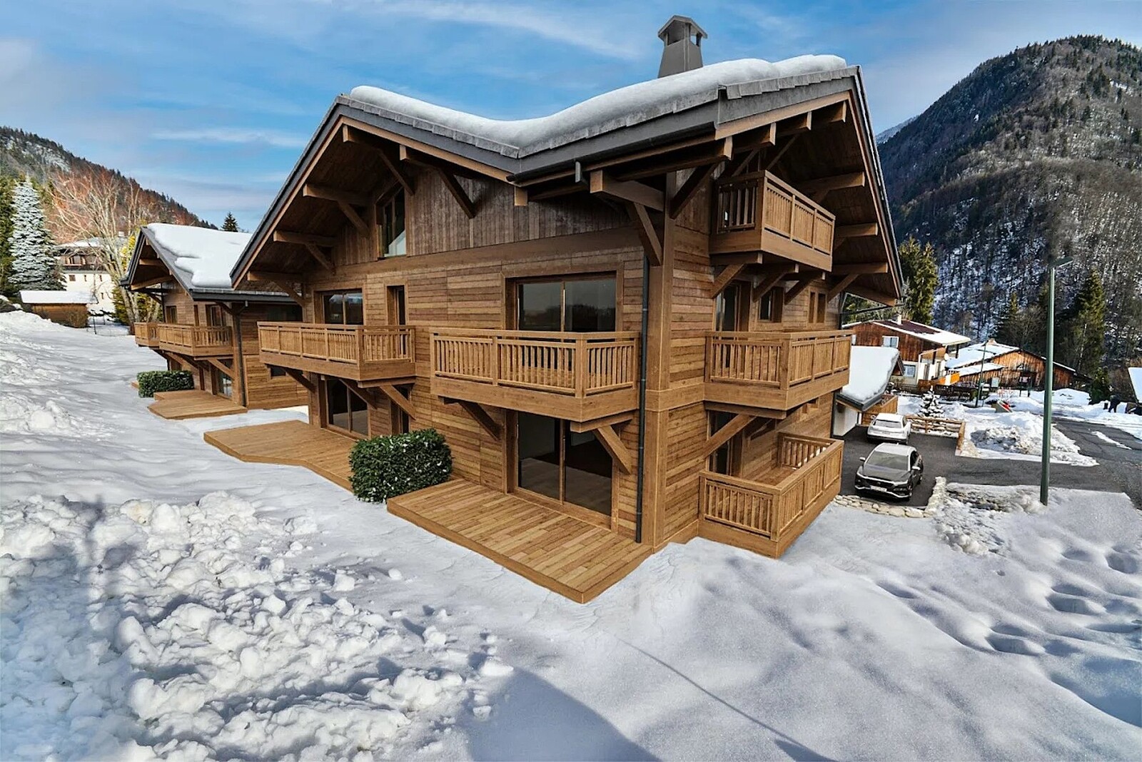Clos des Cimes is a newly built development in Essert Romand, comprising 8 apartments in 2 buildings and 2 detached chalets. Located on a quiet side road, it is just minutes from the village centre and enjoys excellent sun exposure plus stunning mountain views.
