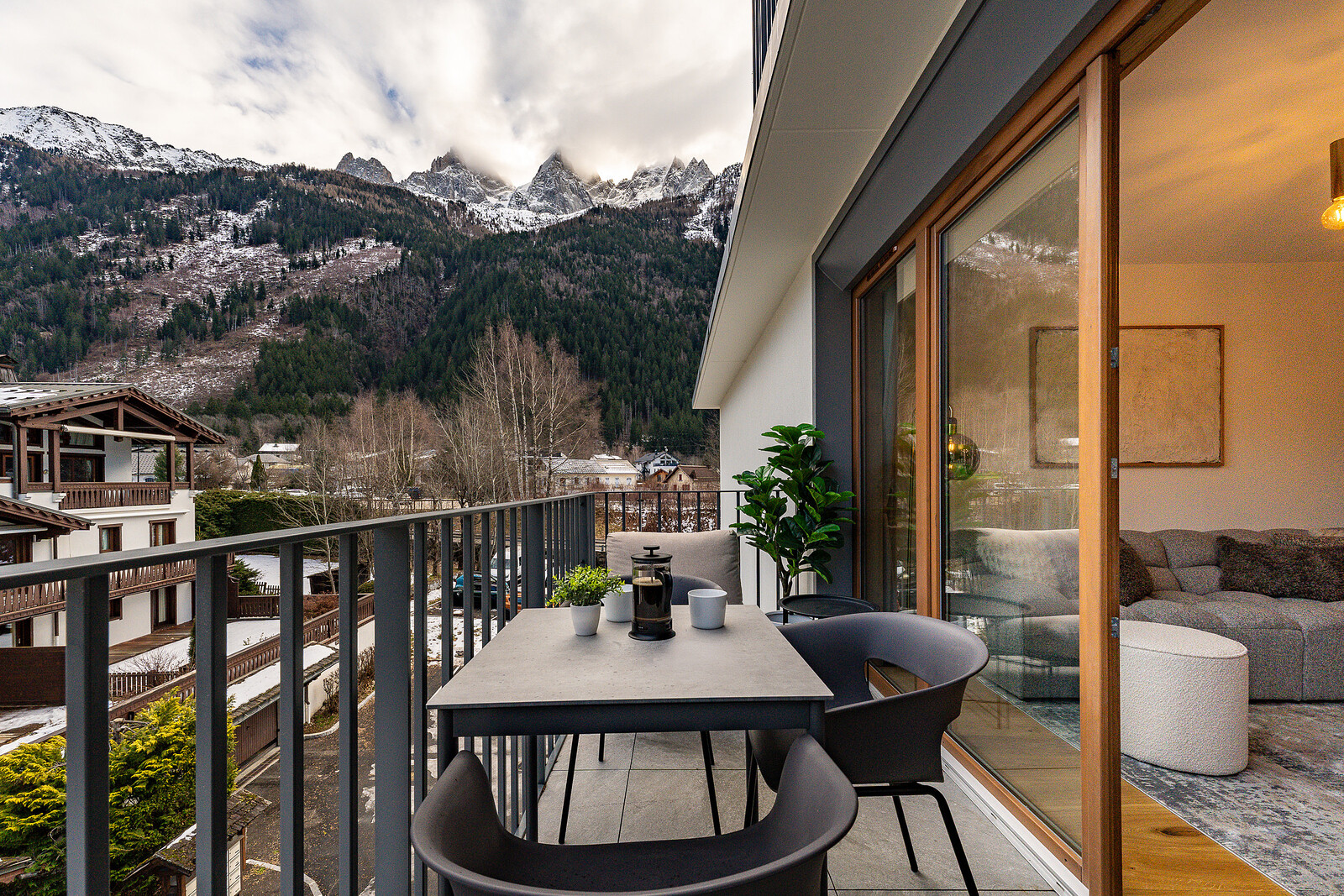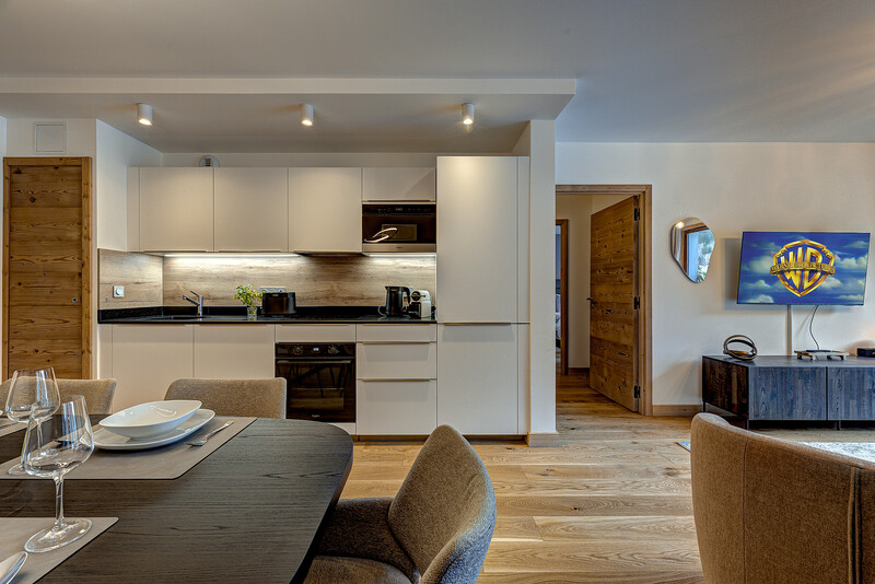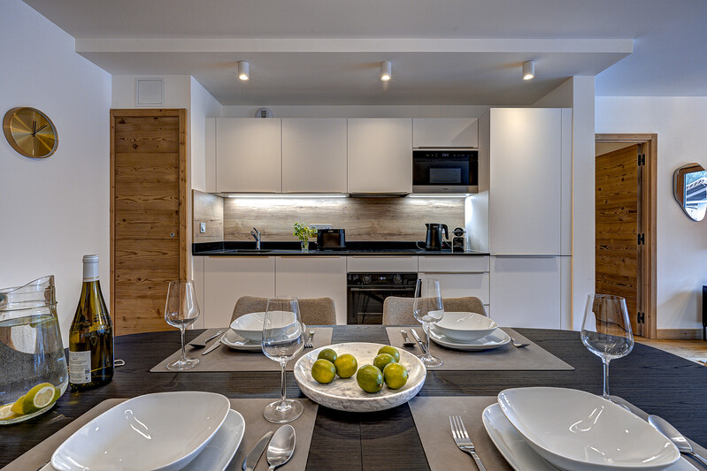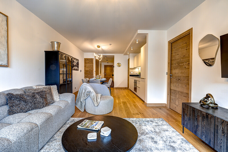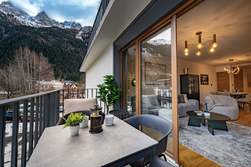 Blanc Mont Blanc is a new development, (completed August 2025), in the centre of Chamonix and apartment 308 is a 2 bedroom, 2 bathroom property. The open-plan living area is spacious and has glass doors which open onto a balcony with mountain views. Finished to a high standard throughout and with thoughtful interior design, the result is accommodation which is both comfort and stylish.