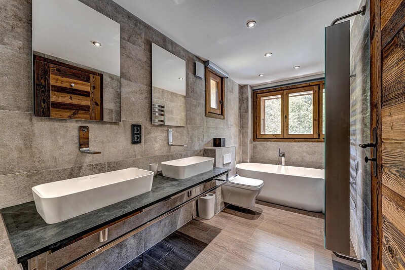 The middle floor comprises four en-suite bedrooms. Two of these could be considered master suites, both including baths and access to the large south-facing balcony. The lower ground floor provides additional entertainment space, including a spacious games and television room with a stylish bar. This floor also has a bedroom, a bathroom, a sauna and access to the mature landscaped garden with a sheltered terrace and hot tub. Furthermore, a heated ski and bike room is accessible from the driveway.