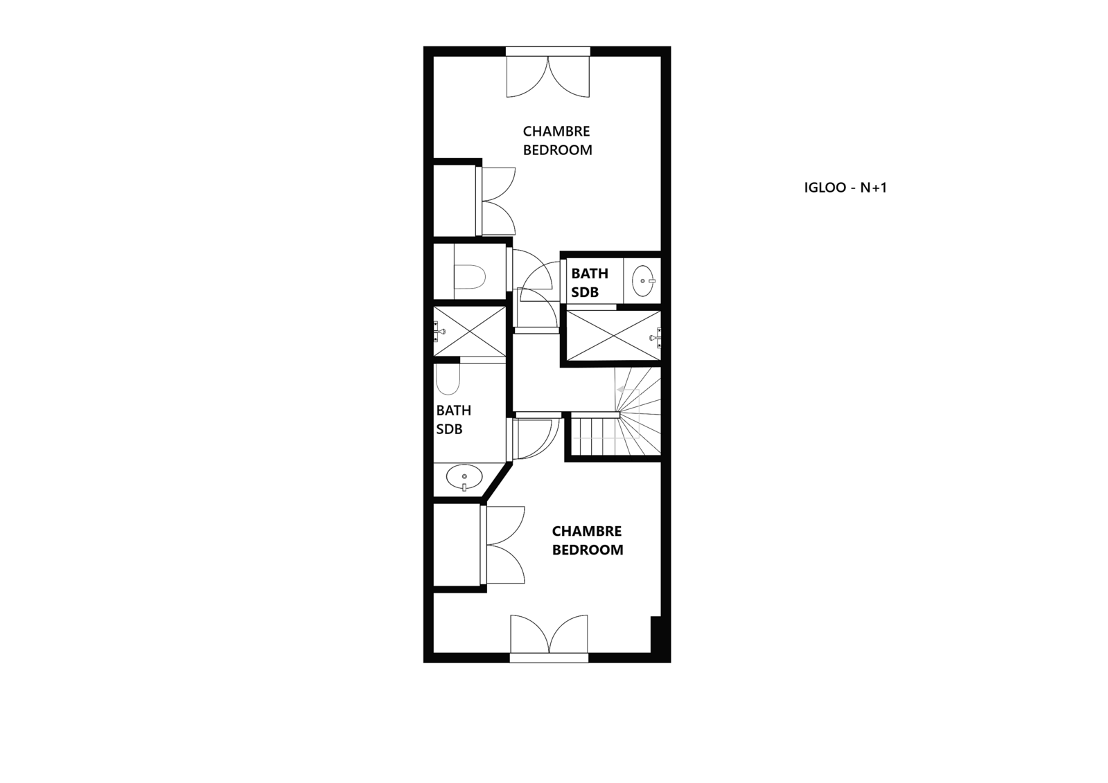 Apartment Igloo is a spacious 2-bedroom, 2-bathroom duplex apartment with its own private entrance, located just 1 km from the centre of Morzine. Arranged over two levels, it offers a generous open-plan living area and two en suite bedrooms, each with its own private balcony. A guest WC is located on the ground floor.