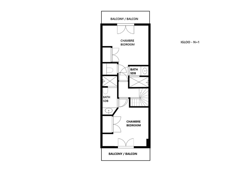 Apartment Igloo is a good-sized 2-bedroom, 2-bathroom duplex apartment with its own entrance, a 15-minute walk to the north-west of Morzine centre. On the ground floor, the open-plan living space opens onto a small terrace/garden with views along the Valley towards Montriond. The upper floor comprises 2 bedrooms, both of which are ensuite (with WCs) and each with their own balconies.