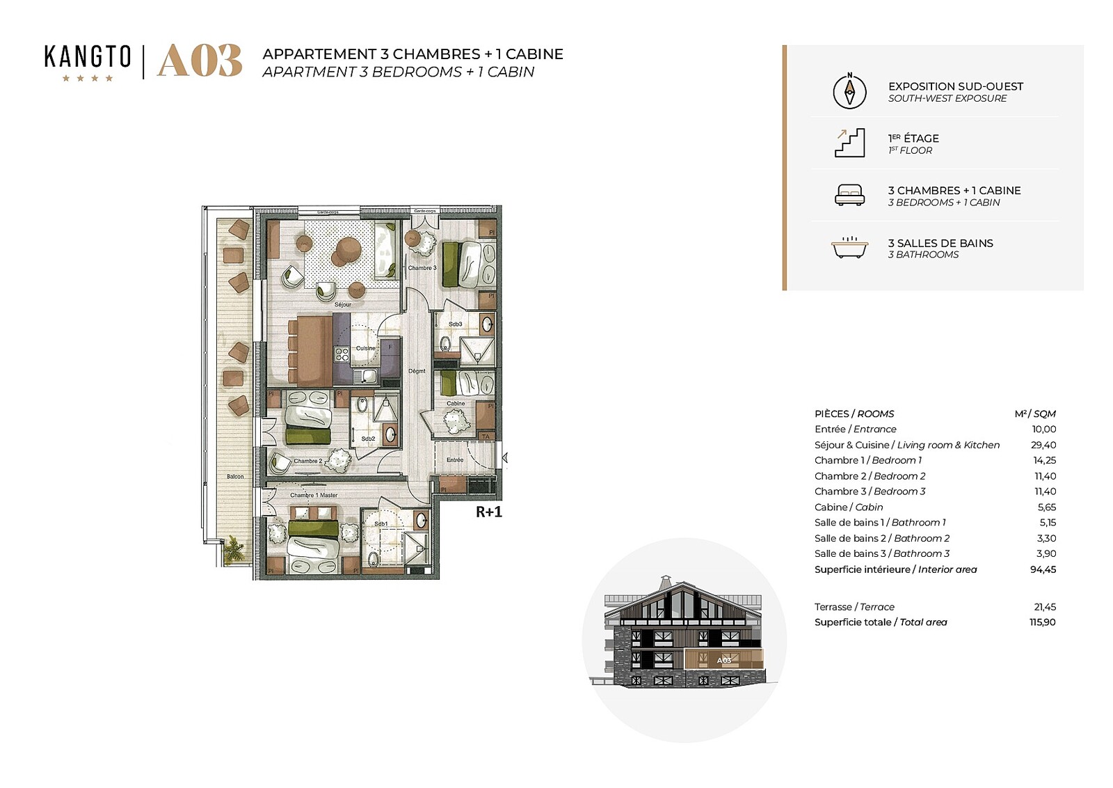 The Kangto residence couldn’t be better placed, in the centre of Les Gets only minutes on foot from the high street and ski lifts. These luxury apartments will be finished with high quality materials and fixtures, and come with a cave, parking space and ski room. Each apartment is sold fully furnished. There is also access available to the wellness and spa area in the neighbouring Kinabalu residence.