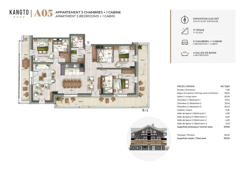The Kangto residence couldn’t be better placed, in the centre of Les Gets only minutes on foot from the high street and ski lifts. These luxury apartments will be finished with high quality materials and fixtures, and come with a cave, parking space and ski room. There is also access available to the wellness and spa area in the neighbouring Kinabalu residence.