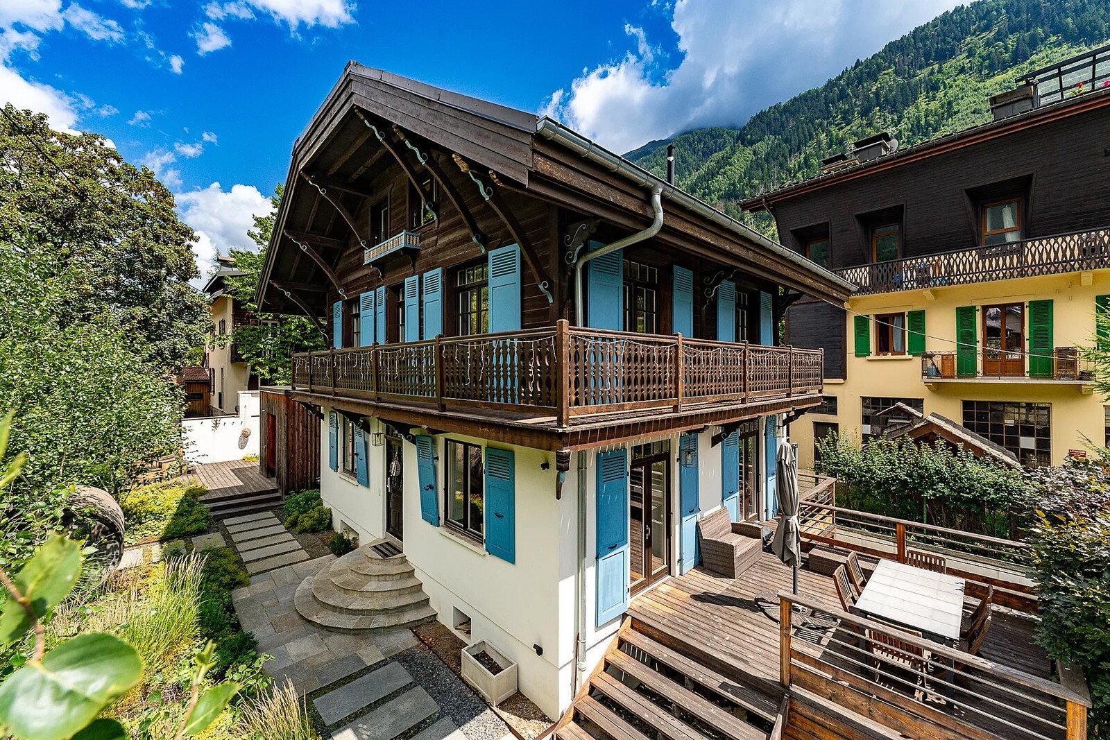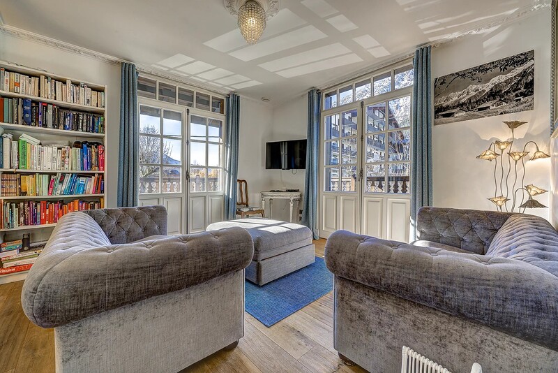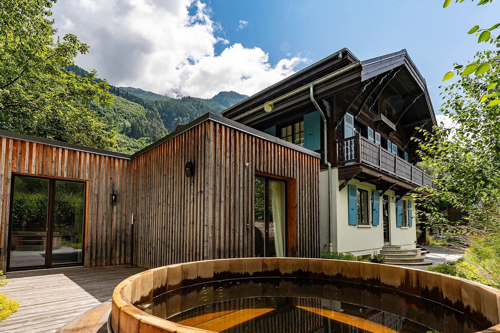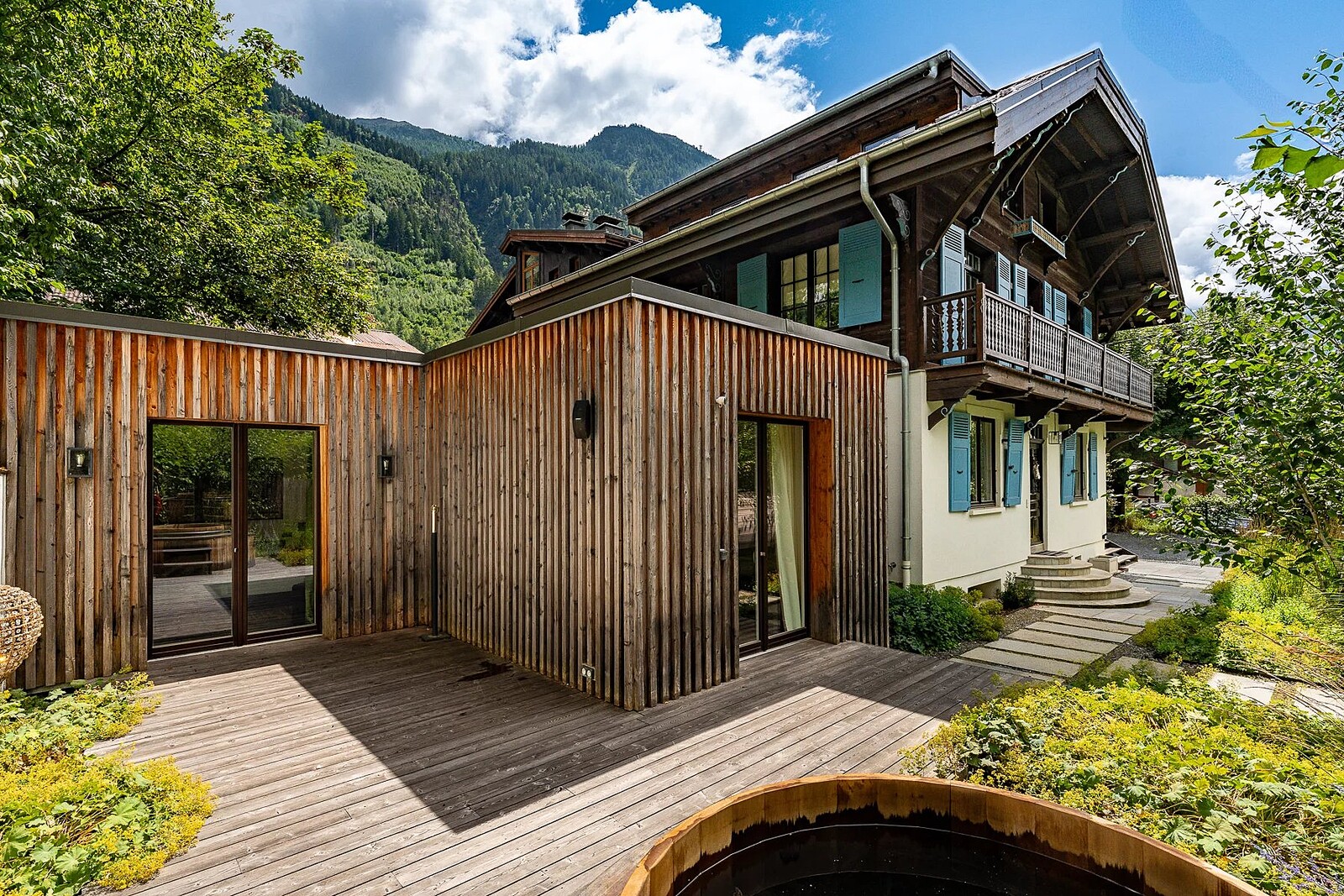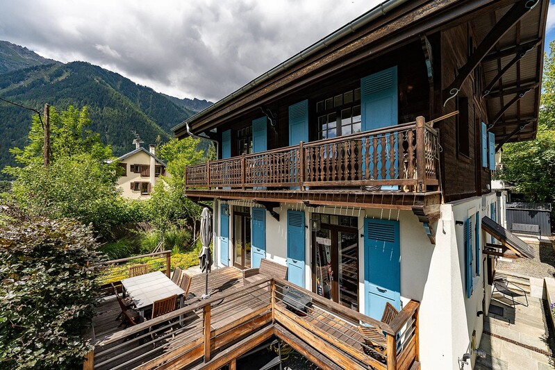 Chalet Blaitière is a beautifully stylish, 6-bedroom property in central Chamonix, currently used as 4 separate apartments but perfectly set-up to occupy as a single dwelling. Accessed via a private drive, just to the east of the town centre, the house has a good-sized terrace with jacuzzi and barrel sauna, plus balconies on the 1st floor.