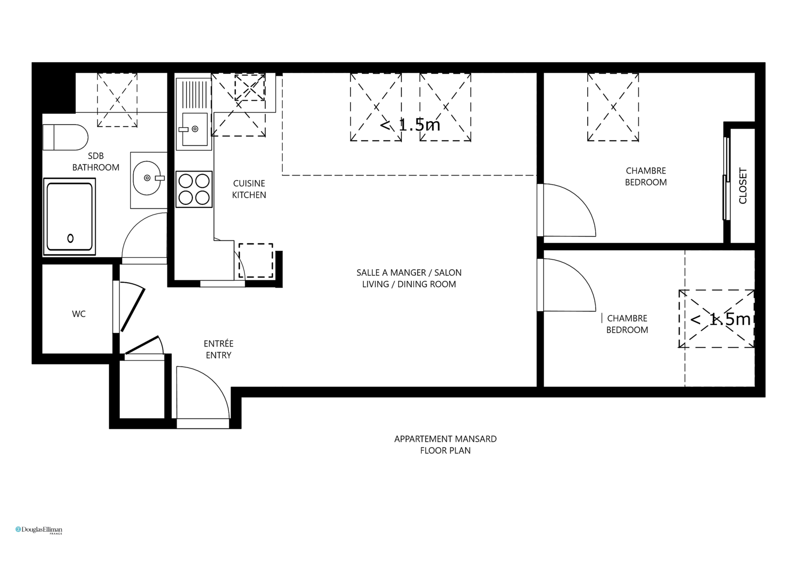 Mansard is a charming, 2-bedroom apartment in the very heart of Chamonix, situated on the top floor of an historic building on the main street. With extra ceiling height in much of the open-plan living space, the apartment is full of character with exposed beams and large, skylight windows revealing the wonderful mountain views.