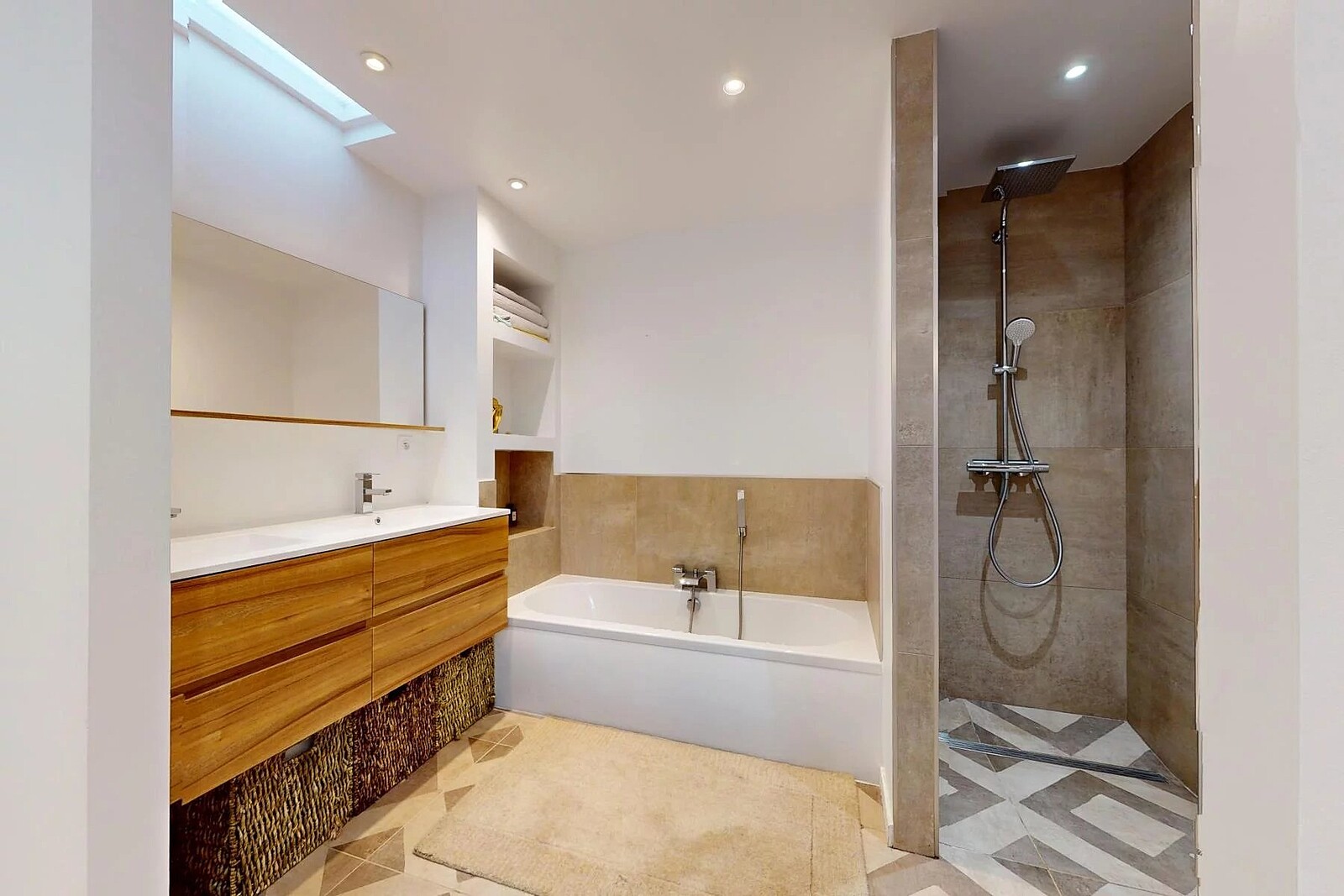 A recently renovated, 4-bedroom apartment in the centre of Chamonix, just off the avenue de l’Aiguille du Midi. Apartment Miroir is on the ground floor and was fully renovated by the current owners in 2019 to provide a large open-plan living space, modern kitchen, separate lounge/TV area, 4 bedrooms and 3 bathrooms, one with sauna.