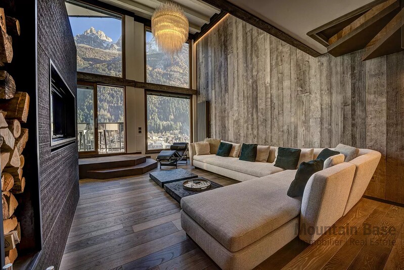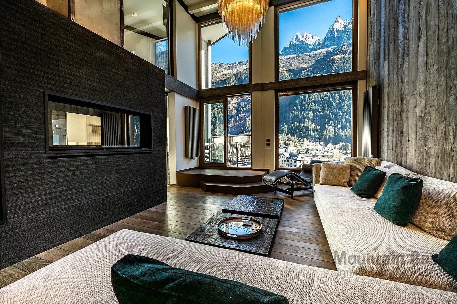 Outa is a magnificent, 3-bedroom duplex penthouse on the 6th and 7th floors in the very centre of Chamonix. The double-height living space has huge, floor-to-ceiling windows that frame the most incredible views over the town centre and of Mont Blanc and the surrounding peaks.
