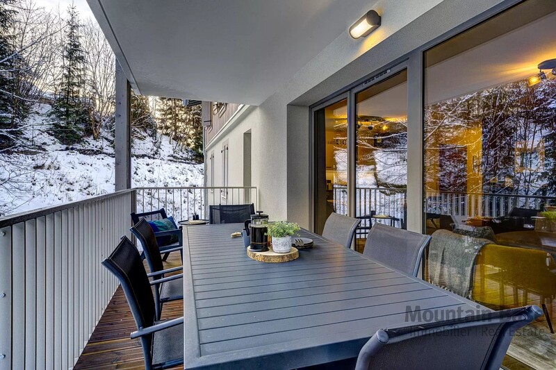 There is a large balcony, sufficient for outdoor dining, with a southern aspect and mountain views. The property comes with a ski locker with heated boot rack and a double, underground garage.